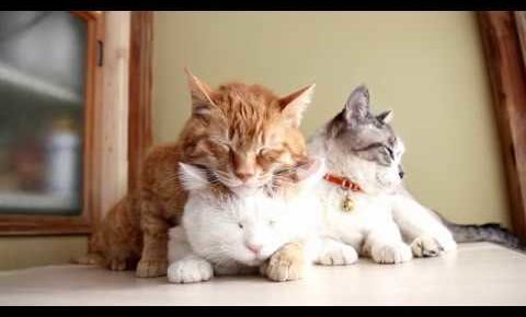 まるでゲームのように、ぴったりと重なるシロと茶トラ。そんな2匹に寄りかかって眠るクロ。3匹の仲睦まじい姿に、見ているこちらまでリラックスしてしまいそう。